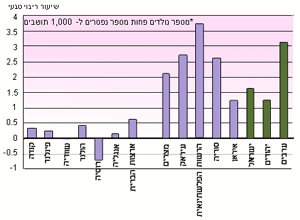 דיאגרמת עמודות המציגה את שיעורי הריבוי הטבעי במספר מדינות מפותחות ובארצות השכנות בשנים 2000-2001. הבדלים גדולים קיימים ברמת הריבוי הטבעי (הפרש בין מספר הנולדים והנפטרים) בין הארצות המפותחות לבין הארצות המתפתחות. שיעור הריבוי הטבעי בישראל גבוה יחסית ודומה לזה של ממוצע הארצות המתפתחות. לתמונה מוגדלת