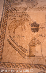 קטע מתוך פסיפס רצפת בית כנסת שהתגלה בעיר ציפורי. קטע זה הוא חלק מארבעת הרצועות המערביות של הפסיפס שבהן מתואר המקדש. בתמונה נראה קרבן התמיד, השמן והסולת- מרכיבי המנחה והחצוצרות ששמשו במקדש להכרזות שונות.