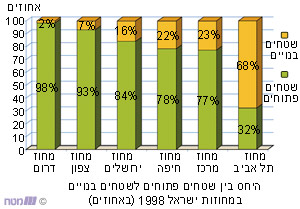 דיאגרמת עמודות המציגה את אחוז השטחים הפתוחים ביחס לשטחים הבנויים, בישראל בשנת 1998. מן הדיאגרמה אפשר לראות שבמחוז הדרום נמצא אחוז השטחים הפתוחים הגדול ביותר - 98% הם שטחים פתוחים ורק 2% מהשטח הכולל הם שטחים בנויים. יחס דומה קיים במחוז הצפון, שבו 93% מהשטחים פתוחים, ו-7% בנויים. במחוז תל-אביב המצב שונה לחלוטין, שם 68% הם שטחים בנויים, ורק 32% הם שטחים פתוחים.