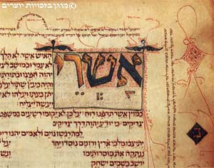 דף מתוך כתב יד של התנ"ך, סרגוסה, 1341. כתב היד עם ניקוד וטעמים ומקושט בפאר רב. בשולי העמוד במקרוגרפיה נכתב ספר השורשים לרבי דוד קמחי (הרד"ק). לתמונה מוגדלת