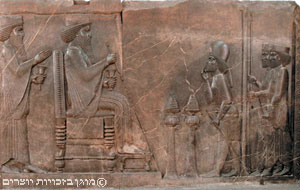 התבליט מאולם הקבלה בארמונו של המלך דריוש ה- 1. המלך יושב ובנו אחשוורוש עומד מאחוריו. ממול- אציל מָדי קד קידה לפני המלך.