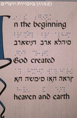 The first verse of Genesis, written in English, Hebrew and Braille. Braille translates the letters of all languages into combinations of six raised dots, reading from left to right.