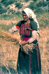 קוצרת כורכת חבילת שיבולים שקצרה.