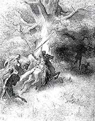 דורה מתאר לפרטי פרטים כל אלמנט בתמונה. למשל: התיאור המפורט של עלוות העץ או ההברקה של המתכת היוצרת את המגן. הדמויות והסוסים מתוארים באופן נפחי, כחיקוי למראה הגוף במציאות: ראו, למשל, את אחוריו של הסוס. באיור ישנו הבדל, התואם את המציאות, בין האזור החשוך מתחת לעץ שבו לא ניתן להבחין בפרטים, ונראית רק צללית, לבין האזור המואר שבו הפרטים מתוארים באופן מפורט.